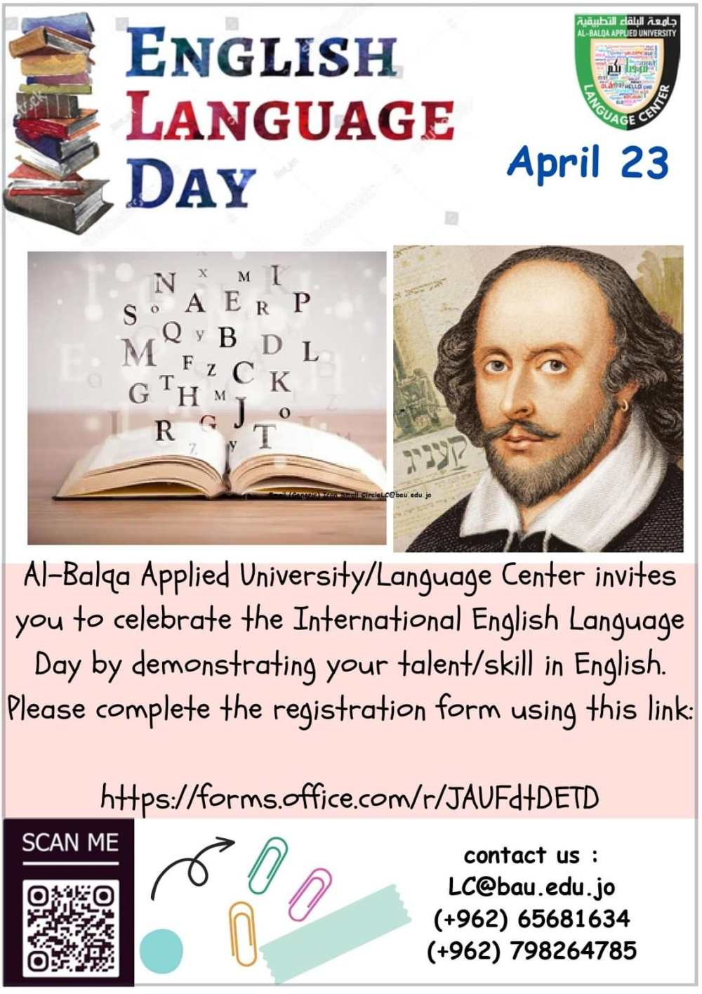 يدعوكم مركز اللغات في جامعة البلقاء التطبيقية للمشاركة في فعالية الاحتفال باليوم العالمي للغة الإنجليزية وذلك في 23/4/2024، لا تفوتوا هذه الفرصة لعرض مهاراتكم باللغة الإنجليزية والاستمتاع بفعاليات هذا اليوم.