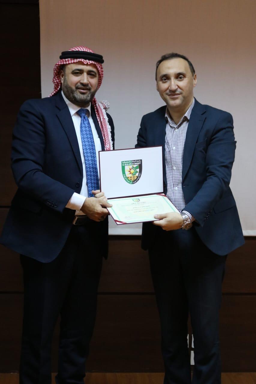وفي ختام المحاضرة قدم عميد الكلية شهادة شكر وتقدير لعطوفة الدكتور مراد الرفاعي على ما قدمه من مساهمة طيبة في المجلس العلمي.