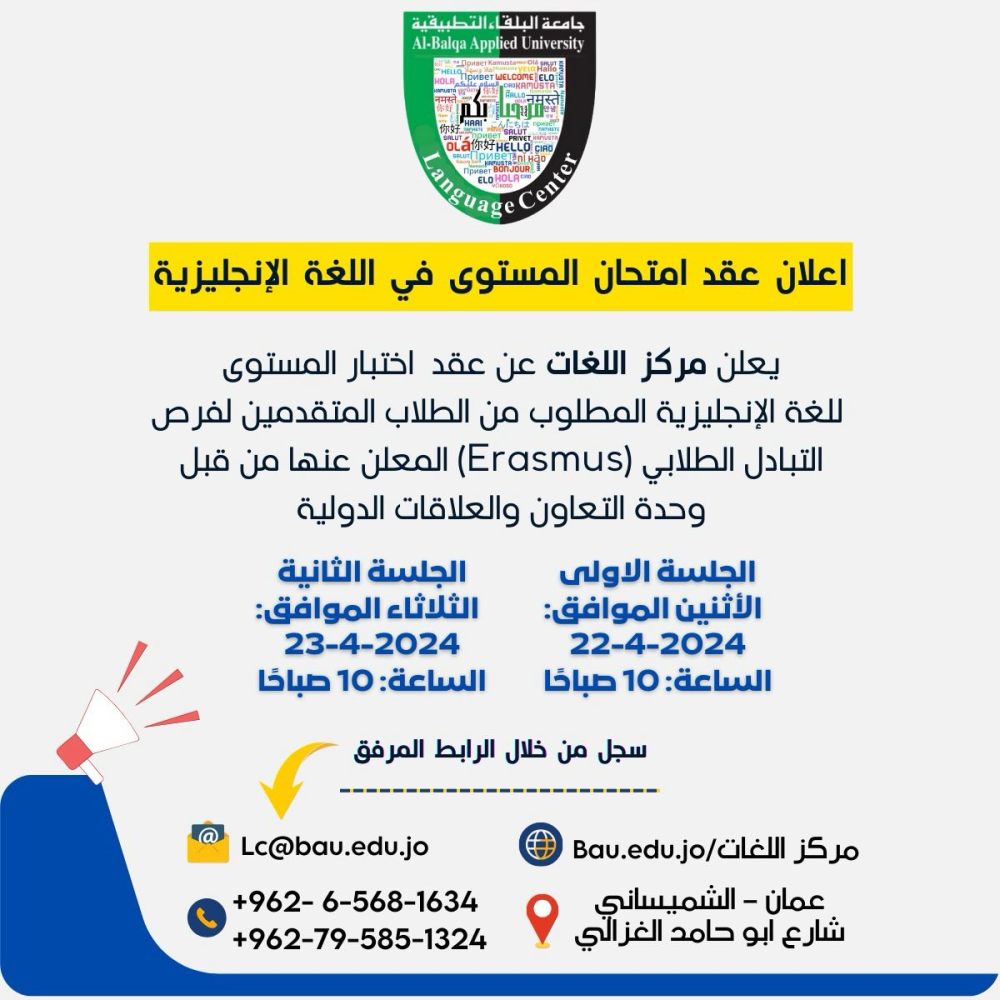 يعلن مركز اللغات عن عقد اختبار المستوى للغة الإنجليزية المطلوب من الطلاب المتقدمين لفرص التبادل الطلابي (Erasmus) المعلن عنها من قبل وحدة التعاون والعلاقات الدولية.