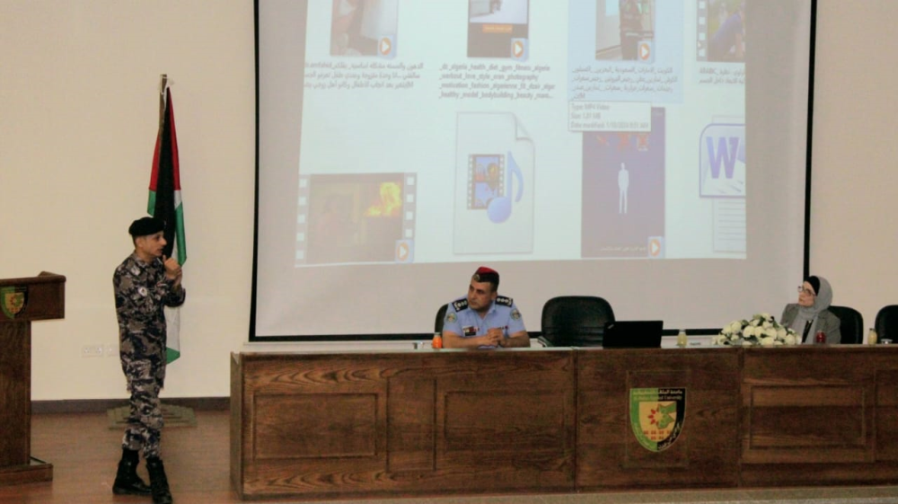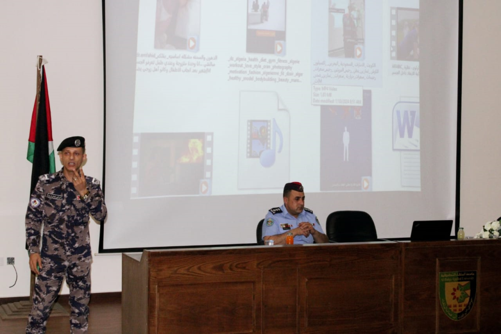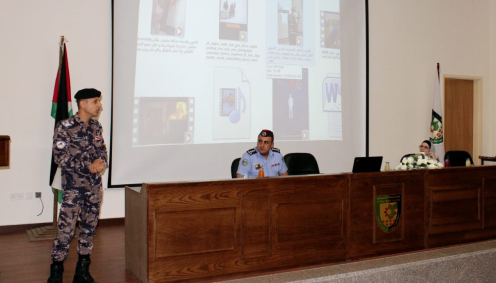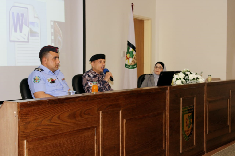 بدأت المحاضرة بالسلام الملكي فكلمة شكر للنقيب معن القضاة /الشرطة المجتمعية ثمّنَ فيها جهود الكلية وسعيهم الدائم لإقامة فعاليات ومحاضرات تثقيفية وتوعية لطالباتها بالتعاون مع الأجهزة الأمنية