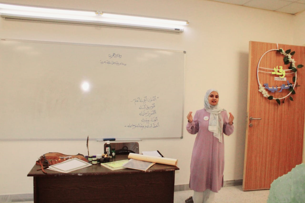بدأت الورشة بكلمة لمساعد العميد للشؤون الطلابية ثمنت فيها جهود النادي الطلابي وقّاد العربية وتعاونهم المستمر مع قسم الشؤون الطلابية بعقد أنشطة تُفيد طالبات تخصص اللغة العربية وآدابها بخاصة، وطالبات الكلية والمجتمع المحلي عامة. كما وطرحت فكرة عقد مسابقة للخط العربي في الكلية وشجعت الطالبات الموهوبات المشاركة فيها.
