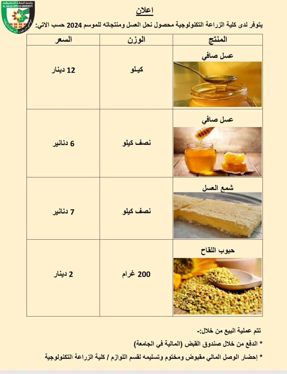 كلية الزراعة التكنولوجية تعلن عن توفر محصول نحل العسل ومنتجاته للعام 2024وحسب الاسعار المرفقة