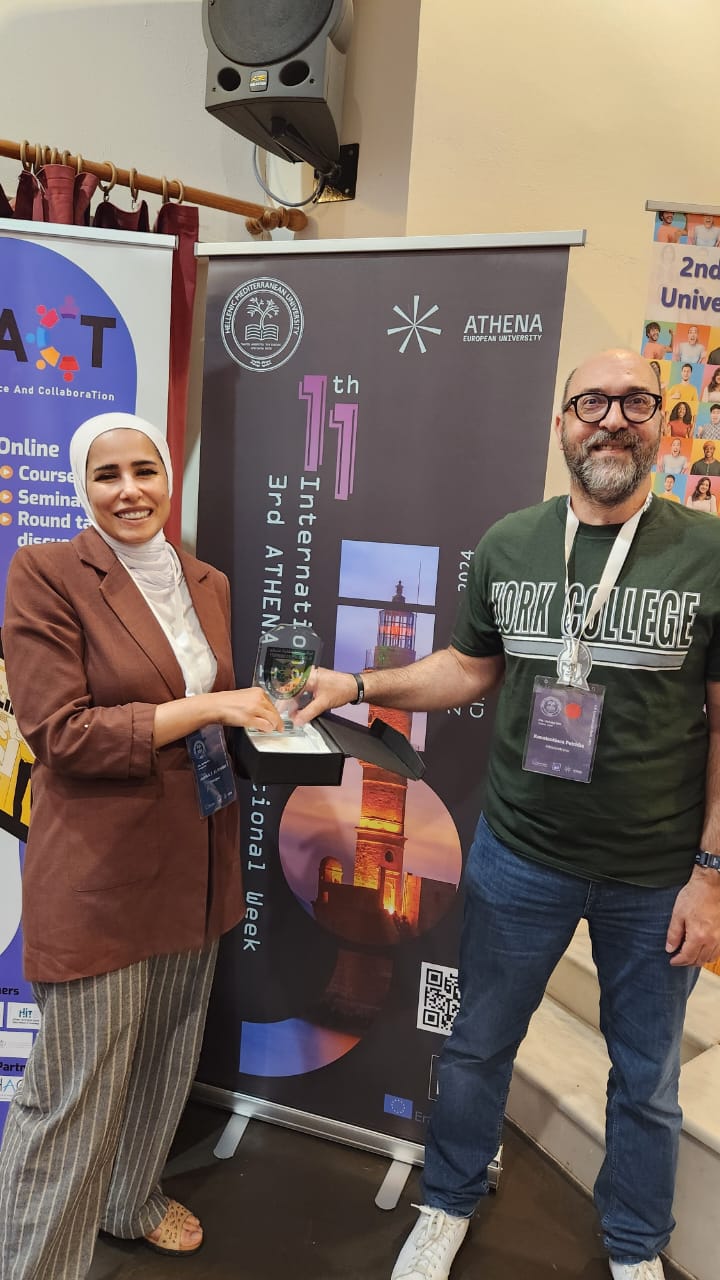 وقامت الدكتورة بتقديم درع جامعة البلقاء التطبيقية لمدير مكتب العلاقات الدولية بالجامعة المستضيفة معربة عن شكر جامعة البلقاء التطبيقية للاستضافة ومثمنة على التجربة المثمرة ومشددة على رغبة جامعة البلقاء التطبيقية بالمشاركة بأي فعاليات قادمة لديهم.