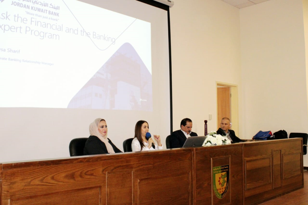 ثم ترك المجال للسيدة ميساء الشريف/ مدير دائرة البنكية الخاصة والاستثمار لكبار العملاء البنك الأردني الكويتي التي قدمت شرح تفصيلي عن مسيرتهما المهنية وأهمية ايجاد التوازن بين الحياة اليومية والاسرية والحياة العملية ومواجهة التحديات. وناقشت مع الطالبات بعض من أسباب النجاح كإدارة الوقت ووضع هدف وإتقان مهارات الاتصال والتواصل والانخراط بالعمل التطوعي لما له أثر كبير في اكتساب الخبرة، والامتنان دومًا لله تعالى بكل أمورنا و أحوالنا.