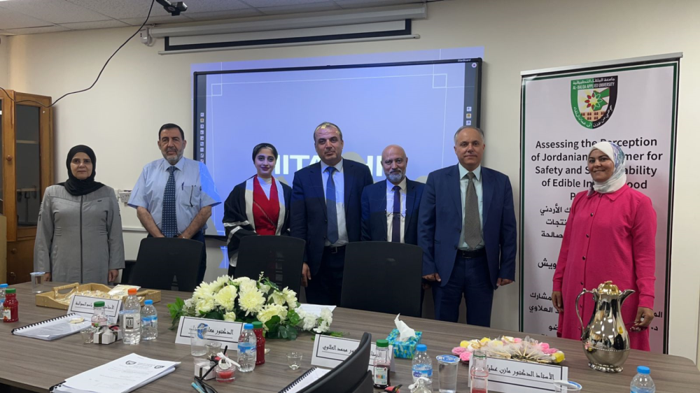 تم بمشيئة الله تعالى مناقشة رسالة الماجستير المقدمة من طالبة الدراسات العليا في برنامج التغذية والتصنيع الغذائي دانا احمد ضيف الله الدرويش بعنوان " Assessing the Perception of Jordanian Consumer for Safety and Sustainability of Edible Insects Food Products" وذلك يوم الاربعاء الموافق 5/6/2024 في قاعة مقدادي/ كلية الزراعة التكنولوجية الساعة الحادية عشر صباحاً. حيث ضمت لجنة المناقشة كل من: