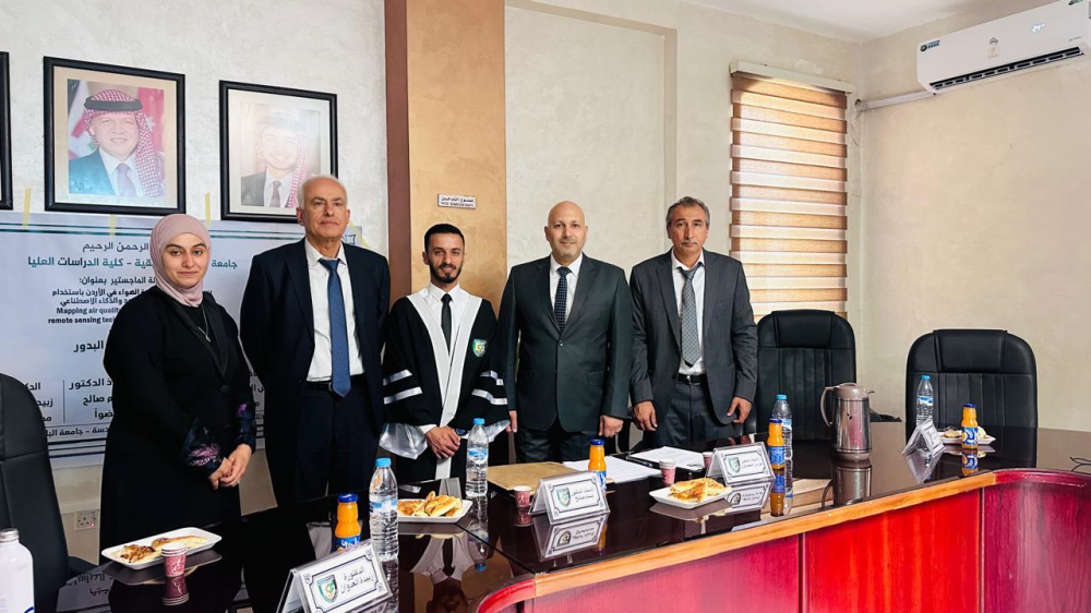 تم في كلية الهندسه مناقشة رسالة الماجستير ضمن برنامج ماجستير هندسة الجيوماتكس للطالب مؤمن كايد محمود البدور تحت عنوان (رسم خرائط معايير جودة الهواء في الأردن باستخدام تقنيات الإستشعار عن بعد والذكاء الاصطناعي) وتكونت لجنة المناقشة من الأستاذ الدكتور نورس نايف تركي شطناوي مشرف رئيسي والأستاذ الدكتور عمر احمد محمد البياري و الأستاذ الدكتور بسام محمود الحاج صالح والدكتور زبيدة علي بركات العدوان ممتحنا خارجيا