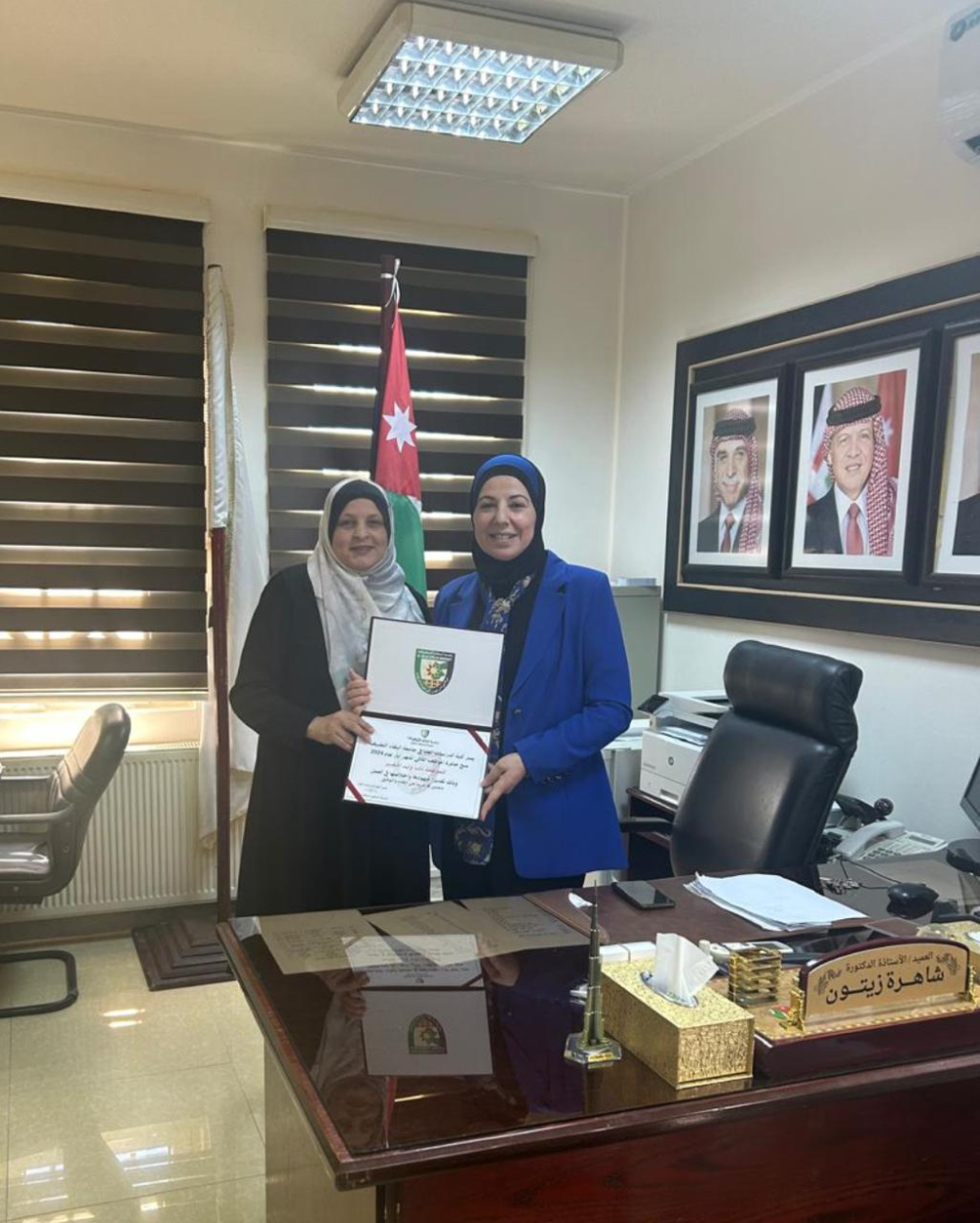 انطلاقا من رؤية جامعة البلقاء في الريادة والابتكار والتميز وتجسيداً لتوجيهات إدارة الجامعة ممثلة برئيسها الأستاذ الدكتور احمد فخري العجلوني  في تحسين الأداء والتطوير وتحفيز قيم التنافس البناء في العمل لدى الموظفين سلمت عميد كلية الدراسات العليا الأستاذة الدكتورة شاهرة طلعت زيتون شهادة الموظف المثالي عن شهر أيار  2024 للموظفة ناديا الجغبير رئيس قسم الدراسات الانسانية ، بحضور أسرة العمادة.
