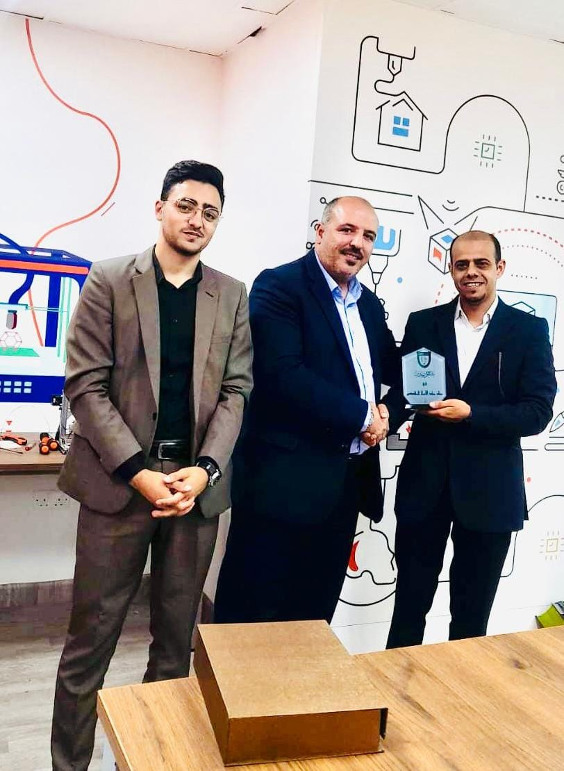 وبالختام كرم مدير مركز الابتكار والإبداع وريادة الأعمال الأستاذ الدكتور البراء عوجان مدير مركز رواد الأعمال المهندسين المهندس معتز العطين تقديرا لتعاونه ودعمه للطلبة المشاركين والسماح لهم باستخدام مرافق مركز رام لتطوير وتصميم روبوتات السومو. وكما تم تكريم المحاضرين بالورشة.