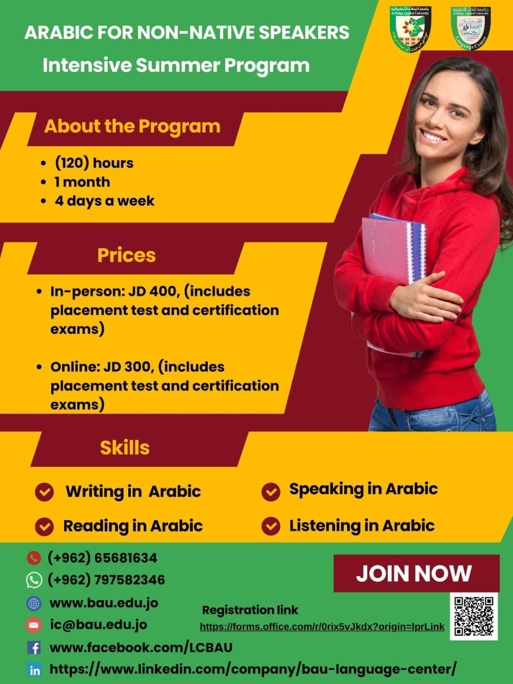 * Online: JD 300 (includes placement test and certification exams)