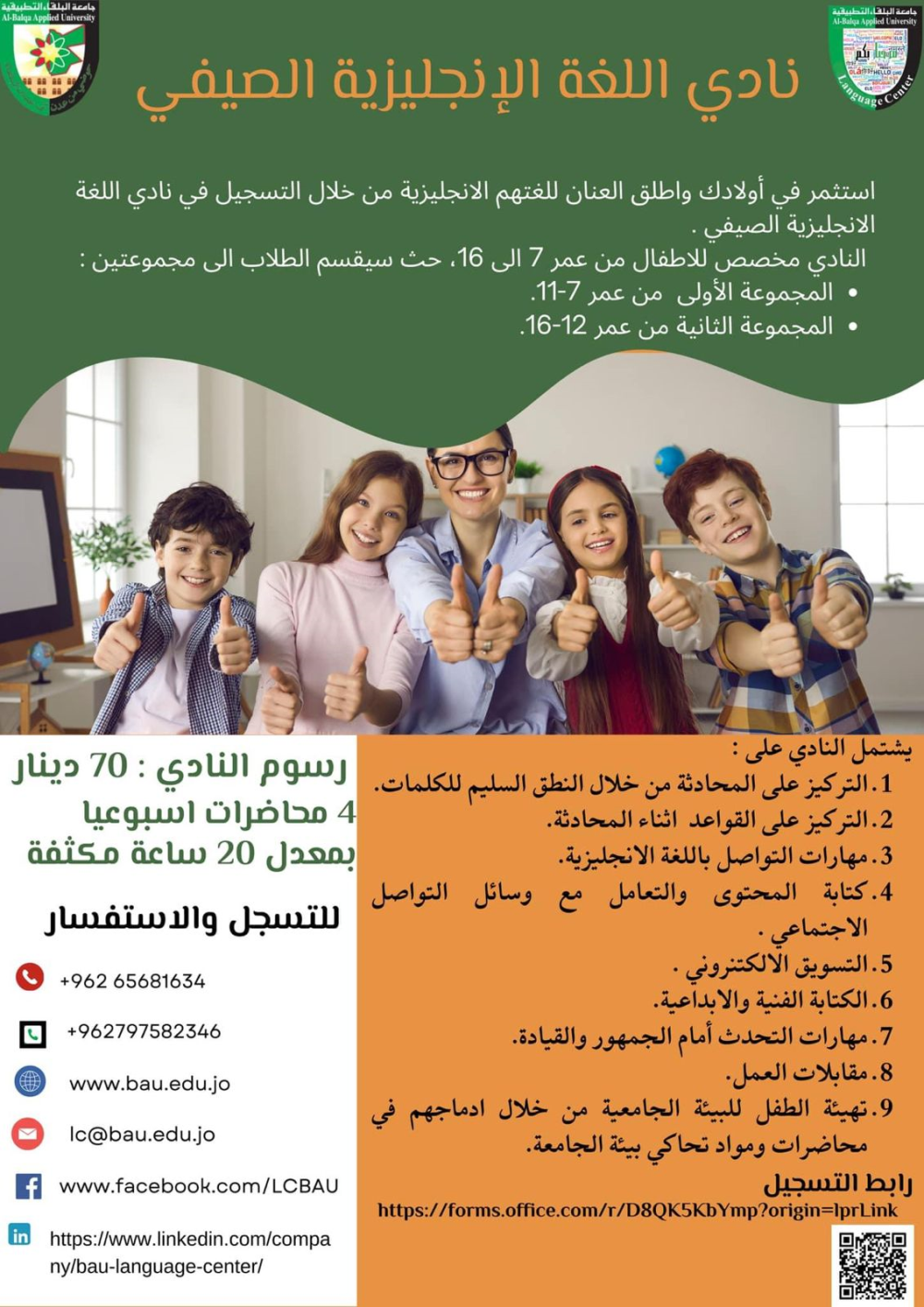 نادي اللغة الإنجليزية الصيفي للصغار هو المكان المثالي لأطفالك لقضاء عطلتهم الصيفية بشكل ممتع ومفيد! انضموا إلينا لبرنامج مليء بالأنشطة التفاعلية، مثل الألعاب اللغوية، القصص الممتعة، والأغاني التعليمية، التي تساعد على تطوير مهارات اللغة الإنجليزية لدى الأطفال بطريقة مرحة ومشجعة. نقدم بيئة آمنة ومليئة بالإبداع حيث يمكن للأطفال التعرف على أصدقاء جدد واكتساب ثقة أكبر في التحدث بالإنجليزية. دع أطفالك يعيشون تجربة صيفية لا تُنسى مع نادي اللغة الإنجليزية الصيفي!