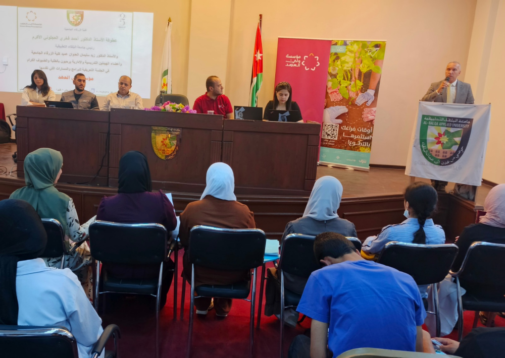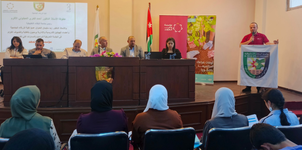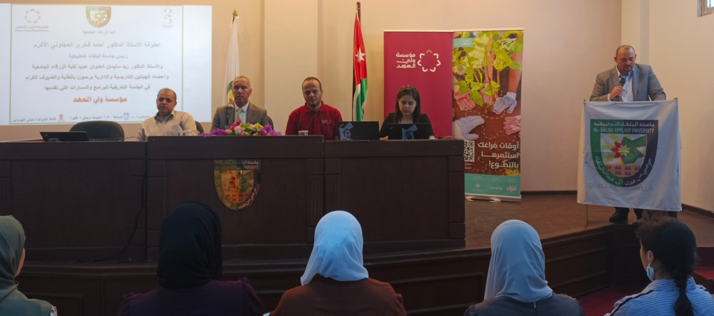 ضمن رؤية ورسالة جامعة البلقاء التطبيقية في تحقيق أهداف التنمية المستدامة وريادة المجتمع المعرفي وبتوجيهات من عطوفة الأستاذ الدكتور أحمد فخري العجلوني رئيس الجامعة بضرورة تقديم التعليم والخدمة المجتمعية على أعلى مستوى، عقدت مؤسسة ولي العهد من خلال مكتب الزرقاء جلسة تعريفية ببرامجها في حرم كلية الزرقاء الجامعية وبحضور الأستاذ الدكتور زيد سليمان العدوان عميد الكلية ومساعد العميد لشؤون التدريب والتطوير والجودة وعدد من أعضاء الهيئة التدريسية والإدارية والطلبة.
