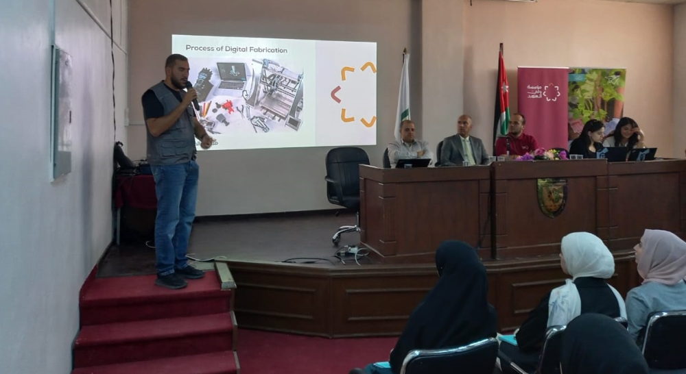 ثم تقدم المهندس احمد فارس من (مساحة الصناع) وهي إحدى برامج مؤسسة ولي العهد والتي تعنى بتعليم وتنمية الفكر الابداعي وتطوير مهارات الطلبة في مجال الطباعة الثلاثية الأبعاد الى شرح موجز عن هذه التقنية وآلية الاستفادة من هذا البرنامج وخاصة أن الآت الطباعة متوفرة بشكل مجاني لمن يرغب باستخدامها.