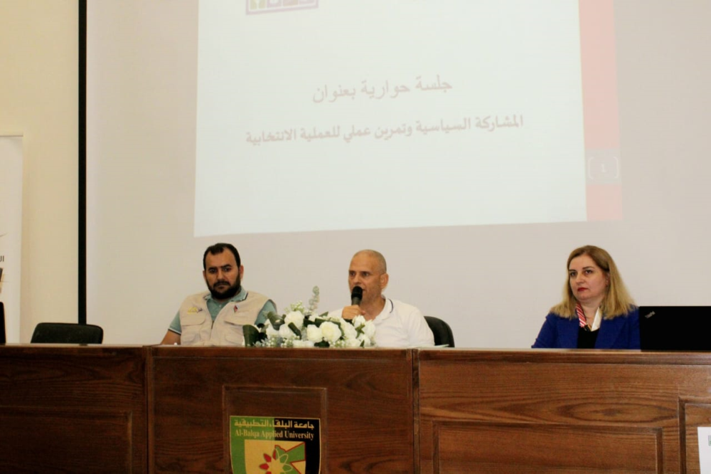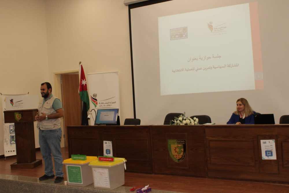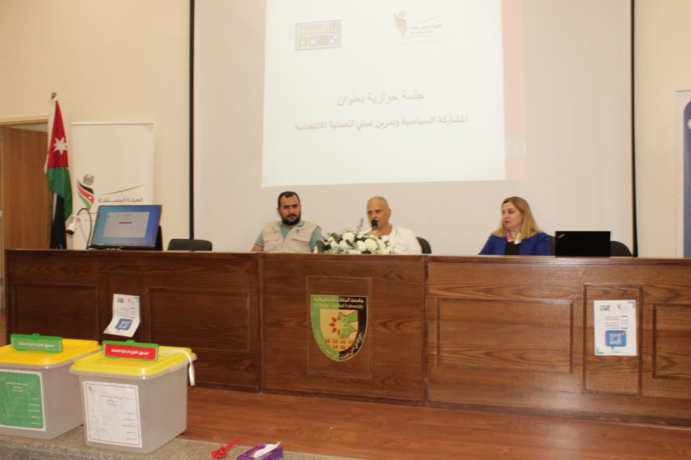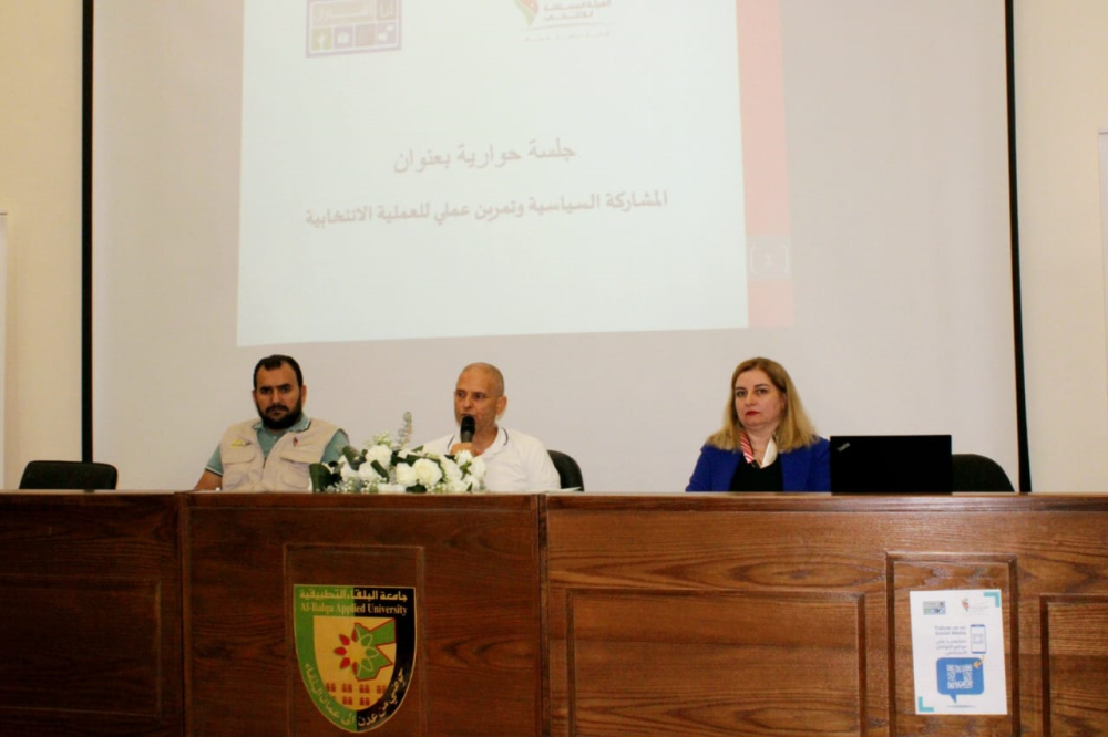 استمرارًا لرؤية جامعة البلقاء التطبيقية ودعمها المتواصل لبرنامج أنا أشارك وتعزيزًا لمشاركة الشباب وتمكينهم في العملية السياسية وعملية صنع القرار في الأردن وبالتنسيق مع مساعد العميد للشؤون الطلابية رعى نائب العميد للشؤون الاكاديمية الاستاذ الدكتور طارق زياد ابو هزيم نيابة عن عميد كلية الأميرة عالية الجامعية الأستاذ الدكتور ناجي السعايدة جلسة حوارية بعنوان (المشاركة السياسية) عقدها برنامج أنا أشارك / مشروع الشراكة- الهيئة المستقلة للانتخاب