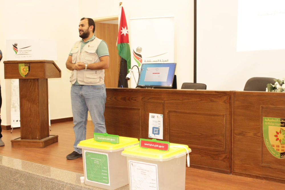 وفي الختام أجري تمرين عملي محاكاة للعملية الانتخابية بمشاركة طالبات برنامج أنا أشارك في الكلية لتطبيق عملية الاقتراع والفرز وللتعريف بقانوني الانتخاب والأحزاب وضمانات النزاهة المتبعة في إجراءات الهيئة المستقلة للانتخاب، وإدارتها للعملية الانتخابية وفقًا لقانون الانتخاب رقم (4)لعام 2022