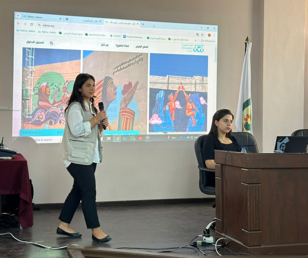 كما قدمت السيدة سماء الرجوب من (منصة نحن) وهي المنصة الوطنية للتطوع ومشاركة الشباب بشرح موجز عن التغير الإيجابي في المجتمعات من خلال الفرص التطوعية التي يتم طرحها على المنصة كما تم التوضيح عن آلية إنشاء حساب على المنصة والتسجيل بالفرص المطروحة للتطوع وأهمية توثيق ذلك.