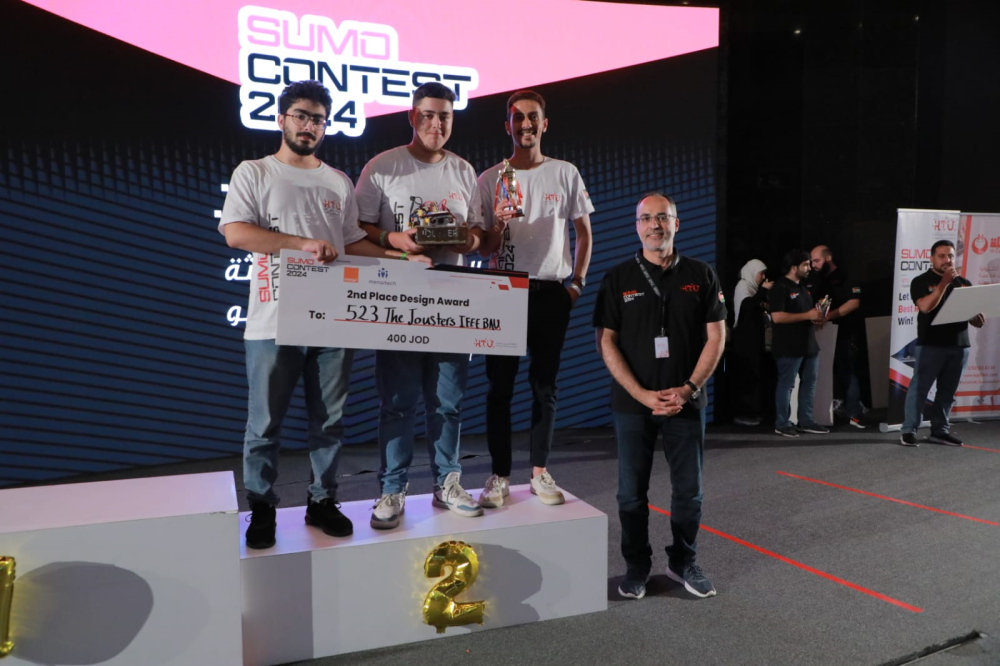 هنأ رئيس جامعة البلقاء التطبيقية الأستاذ الدكتور أحمد فخري العجلوني طلاب نادي جمعية مهندسي الكهرباء و الإلكترونيات في كلية الهندسة التكنولوجية في جامعة البلقاء التطبيقية المشاركين بالمسابقة الوطنية لروبوتات السومو lEE BAU SB المقامة في جامعة الحسين التقنية حيث حصل فريق The Jousters 523 كأفضل مركز ثاني في الميكانيك وفريق فتيات القوة على جائزة أفضل روح فريق.