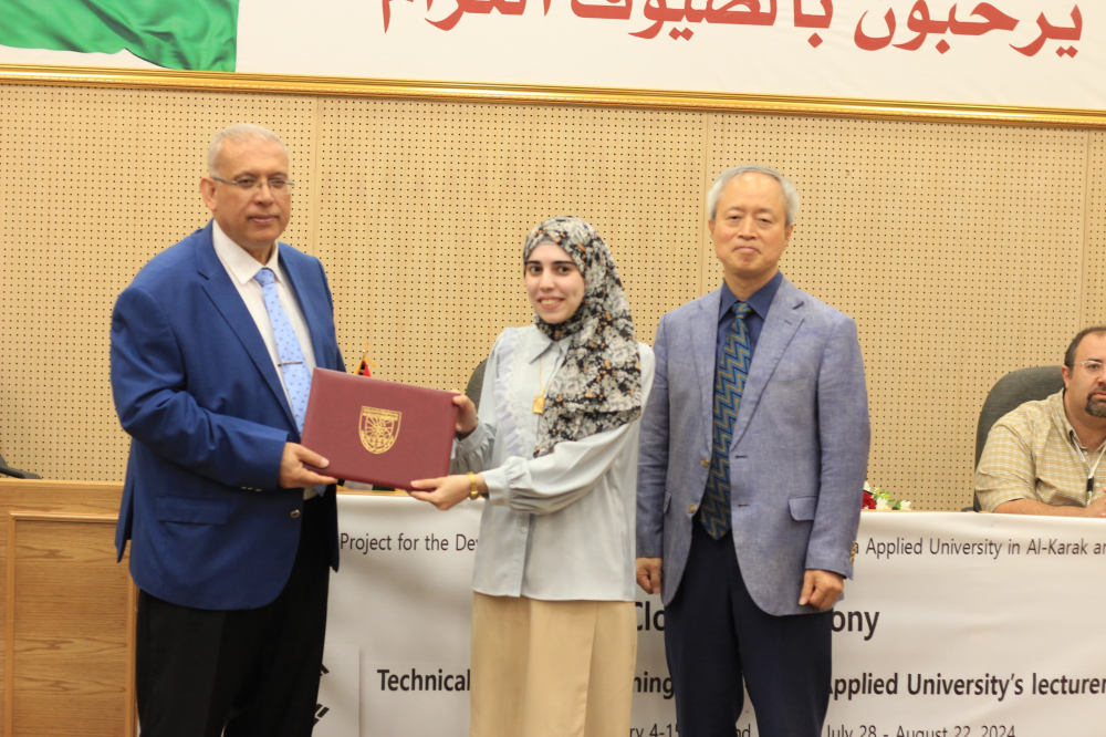 حيث نقل مندوب رئيس الجامعة عميد كلية اربد الجامعية خلال كلمته في حفل الختام، تحيات رئيس الجامعة الأستاذ الدكتور أحمد فخري العجلوني للمشاركين والقائمين على هذه الدورة والتي تهدف إلى تطوير برامج التعليم التقني ورفع كفاءة وقدرات الهيئات التدريسية وتزويدهم بالمهارات اللازمة لمواكبة التطور التكنولوجي ، مؤكداً على أن هذا الانجاز يأتي تجسيداً لرؤية الجامعة المستمدة من توجيهات جلالة الملك عبدالله الثاني حفظه الله وهي سياسة انتهجتها جامعة البلقاء التطبيقية في تشجيع وتطوير التعليم التقني والمهني، وتعزيز الشراكة مع المجتمع المحلي معبراً عن اعتزاز الجامعة والكلية بالعلاقات التي تربطهم بوكالة (KOICA) والجامعات والمعاهد الكورية.