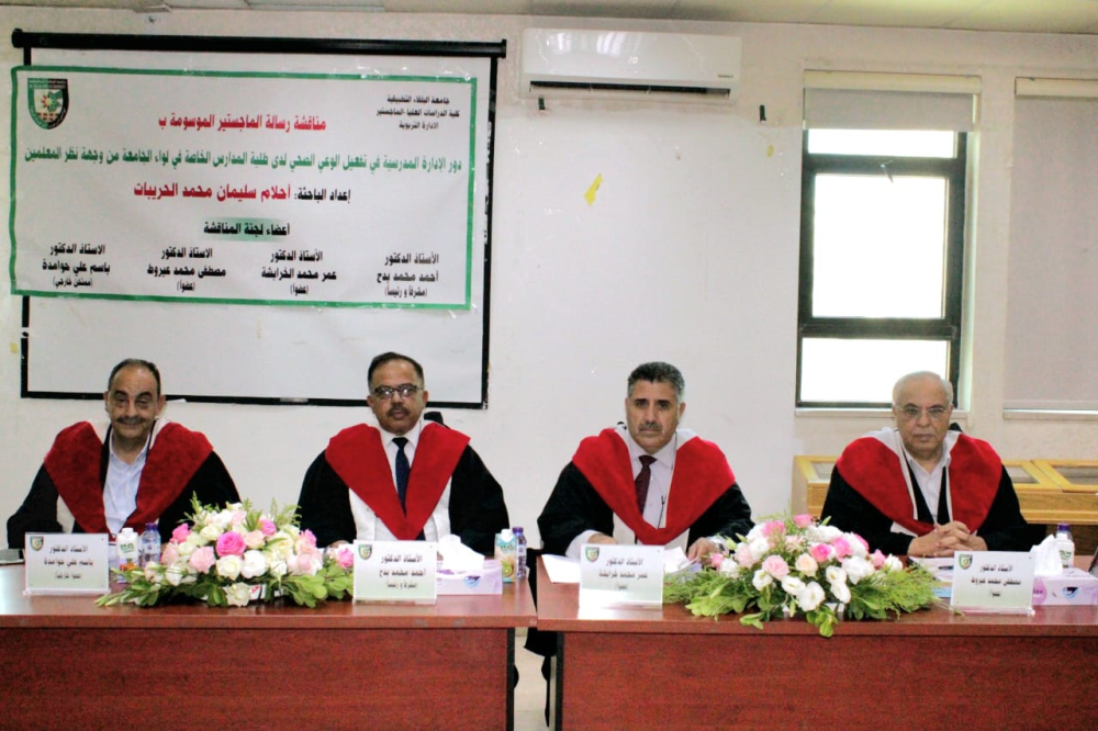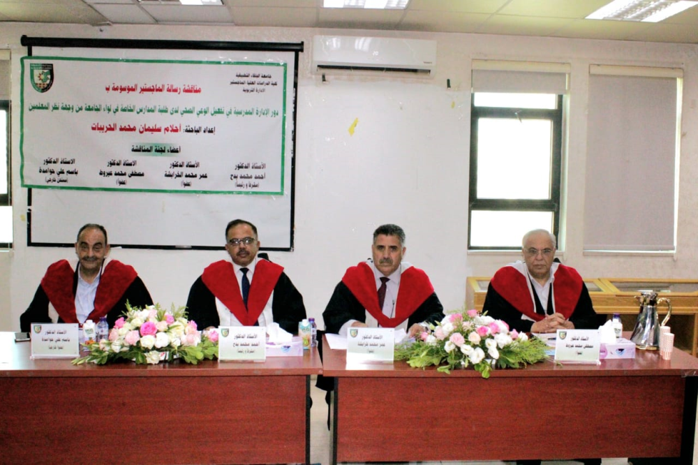 تم في مساء يوم الاربعاء الموافق 28/8/2024 ، مناقشة رسالة ماجستير للطالبة أحلام سليمان الحريبات تخصص الإدارة التربوية  قسم العلوم التربوية والموسومة بـ :
