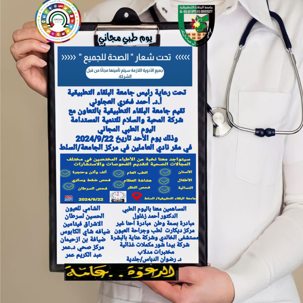 تقيم جامعة البلقاء التطبيقية بالتعاون مع شركة المحبة والسلام للتنمية المستدامة يوم طبي مجاني