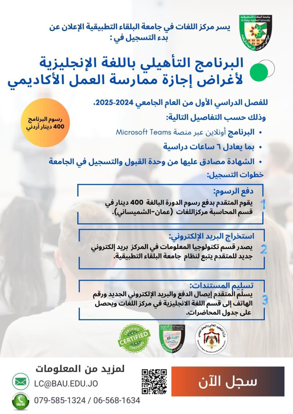 تُعلن جامعة البلقاء التطبيقية/مركز اللغات عن فتح باب التسجيل في البرنامج التأهيلي الأكاديمي باللغة الإنجليزية بما يعادل 6 ساعات دراسية للفصل الدراسي الأول من العام الجامعي 2024-2025