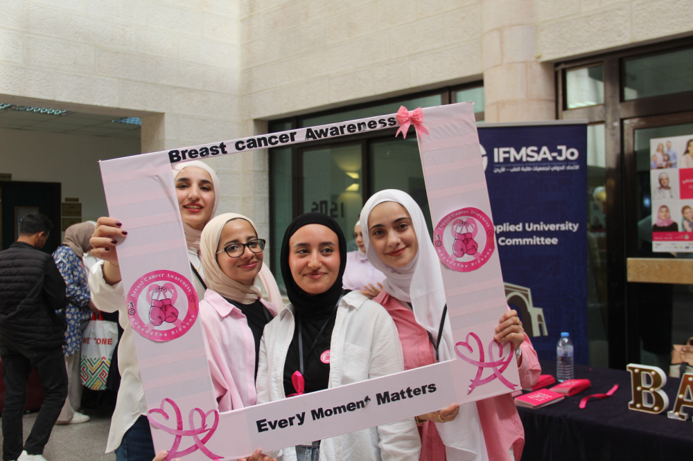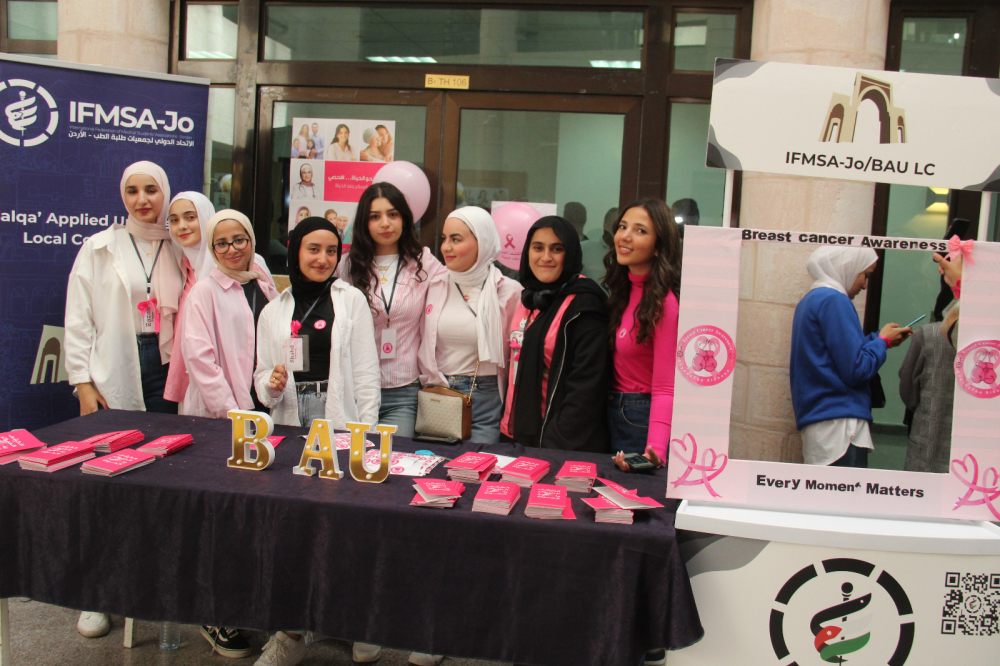 مندوبًا عن رئيس جامعة البلقاء التطبيقية الأستاذ الدكتور أحمد فخري العجلوني رعى نائب الرئيس لشؤون الكليات الطبية الأستاذ الدكتور شادي الحموري فعاليات اليوم التوعوي عن أهمية الكشف المبكر عن سرطان الثدي والذي نظمته وحدة التنمية وخدمة المجتمع المحلي وكلية الطب والإتحاد الدولي لطلبة الطب الأردن بالتعاون مع البرنامج الأردني لسرطان الثدي بحضور عميد شؤون الطلبة الأستاذ الدكتور خلف الختاتنه وعميد كلية التمريض الدكتورة ساره الجعافره والسيدة رشا فخر الدين رئيس قسم التواصل والتنسيق في البرنامج الأردني لسرطان الثدي والدكتوره فدوى ثابت ضابط إرتباط البرنامج الأردني لسرطان الثدي في محافظة البلقاء ومساعد مدير وحدة التنمية وخدمة المجتمع المحلي الدكتور عبدالإله المفلح وعدد من طلبة الجامعة وذلك على مسرح مروان الحمود في الجامعة .