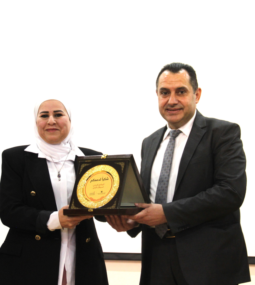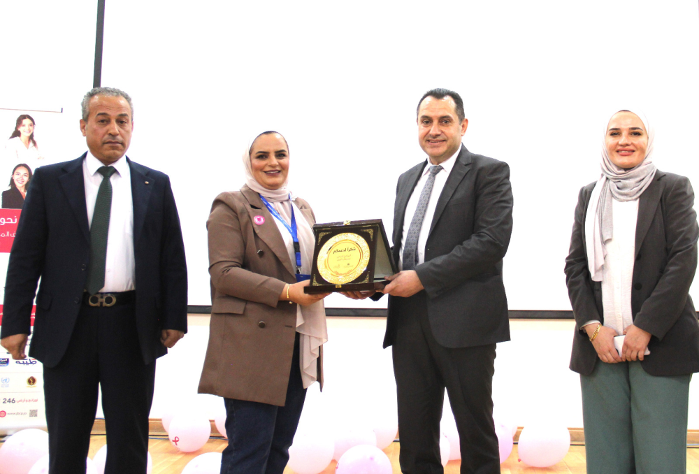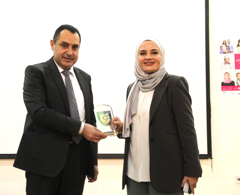 وفي ختام اليوم التوعوي تم تكريم جامعة البلقاء التطبيقية ممثلة برئيسها الأستاذ الدكتور أحمد فخري العجلوني من قبل البرنامج الأردني لسرطان الثدي تسلمه نائب الرئيس لشؤون الكليات الطبية الأستاذ الدكتور شادي الحموري تقديرًا من البرنامج للجهود التي تبذلها الجامعة في عقد مثل هذا اليوم التوعوي للكشف المبكر عن سرطان الثدي.