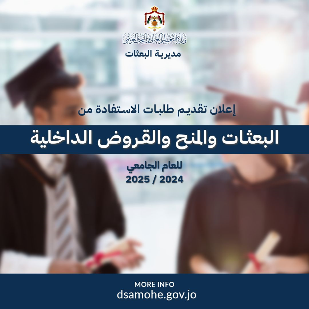 تعلن مديرية البعثات في وزارة التعليم العالي والبحث العلمي للطلبة الأردنيين الملتحقين في الجامعات الأردنية الرسمية ضمن البرنامج العادي لمستوى درجتي البكالوريوس والدبلوم المتوسط عن بدء تقديم الطلبات الإلكترونية للاستفادة من البعثات والمنح والقروض الداخلية للعام الجامعي 2024-2025، والتي يتم تنفيذها من خلال الوزارة اعتباراً من يوم الأحد الموافق 3-11-2024، وحتى الساعة الثالثة والنصف عصراً من يوم الخميس الموافق 14-11-2024.