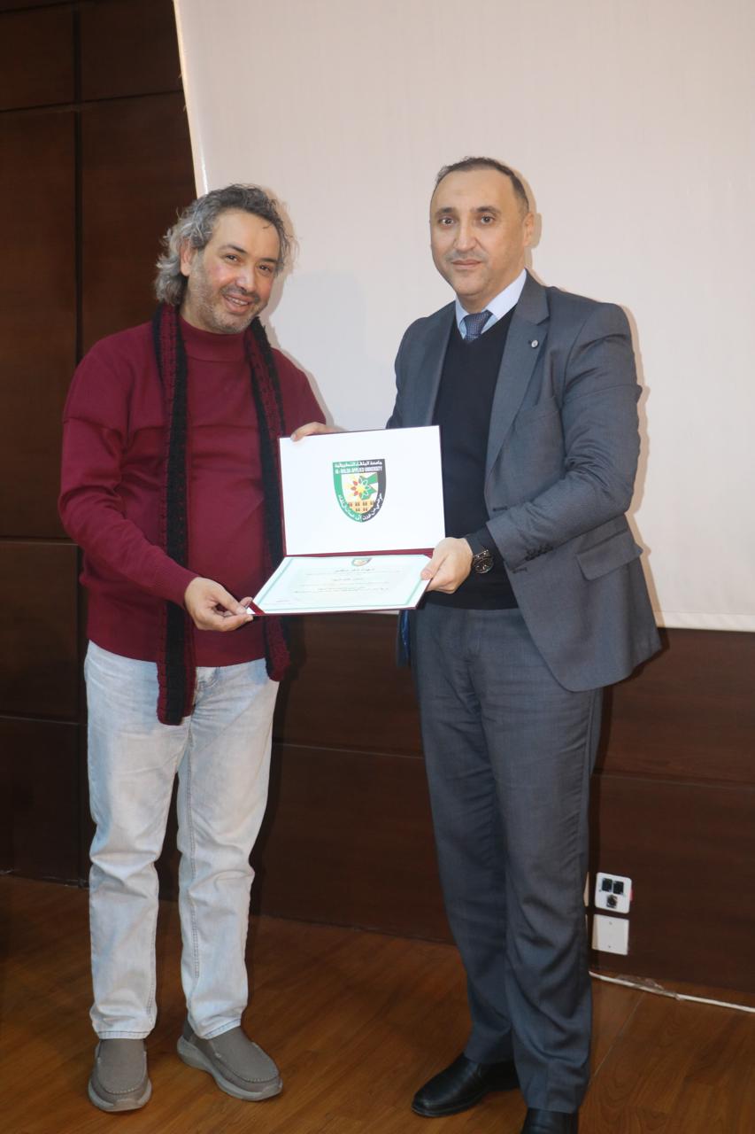 وفي نهاية اللقاء تم تقديم درع الجامعة للضيف الدكتور خليل الزيود .