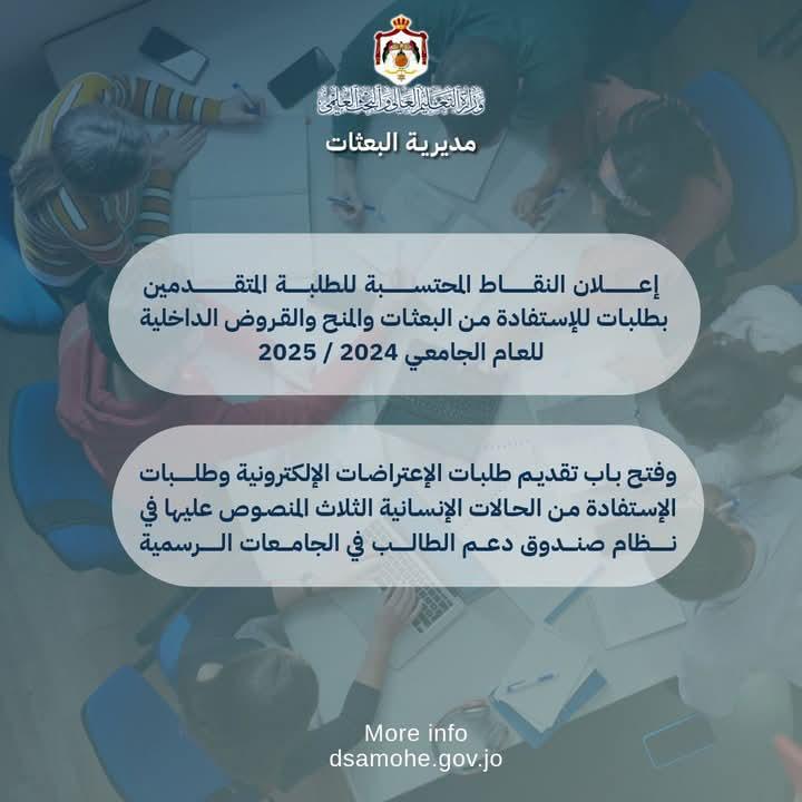 فحرصاً من وزارة التعليم العالي والبحث العلمي على مصلحة أبنائها الطلبة، ولضمان تطبيق أعلى معايير الشفافية أعلنت مديرية البعثات في الوزارة اليوم الخميس الموافق 26-12-2024 البيانات والمعلومات للطلبة المتقدمين بطلبات إلكترونية للاستفادة من المنح والقروض الداخلية للعام الجامعي 2024-2025، إضافةً إلى النقاط المحتسبة لكل منهم، وذلك وفقاً لمعايير الاستفادة من المنح والقروض التي يُعلن عنها وتُنفذ من خلال وزارة التعليم العالي والبحث العلمي للطلبة الدارسين في البرنامج العادي في الجامعات والكليات الأردنية الرسمية، حيث يعتبر هذا الإعلان لأغراض تدقيق الطلبة لنقاطهم وبياناتهم ولا يعتبر ترشيحاً للطالب.