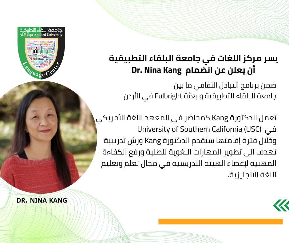 أن يعلن عن انضمام Dr. Nina Kang، ضمن برنامج التبادل الثقافي ما بين جامعة البلقاء التطبيقية و بعثة Fulbright في الأردن.
