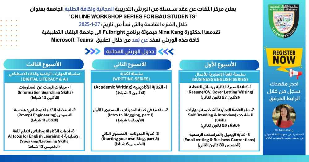 يعلن مركز اللغات عن عقد سلسلة من الورش التدريبية المجانية ولكافّة الطلبة في الجامعة بعنوان (Online Workshop Series For BAU Students )