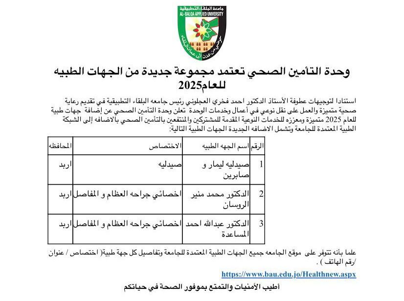وحدة التأمين الصحي تعتمد مجموعة جديدة من الجهات الطبية للعام 2025