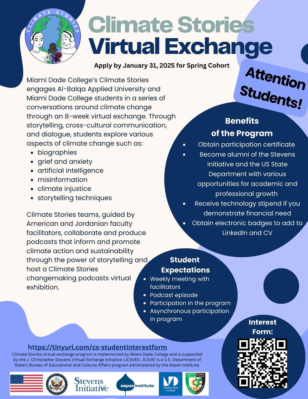 تعاون مع طلاب كلية ميامي داد في برنامج تبادل افتراضي مدته 8 أسابيع لاستكشاف قضايا التغير المناخي من خلال سرد القصص والحوار بين الثقافات. استكشف مواضيع مثيرة مثل: