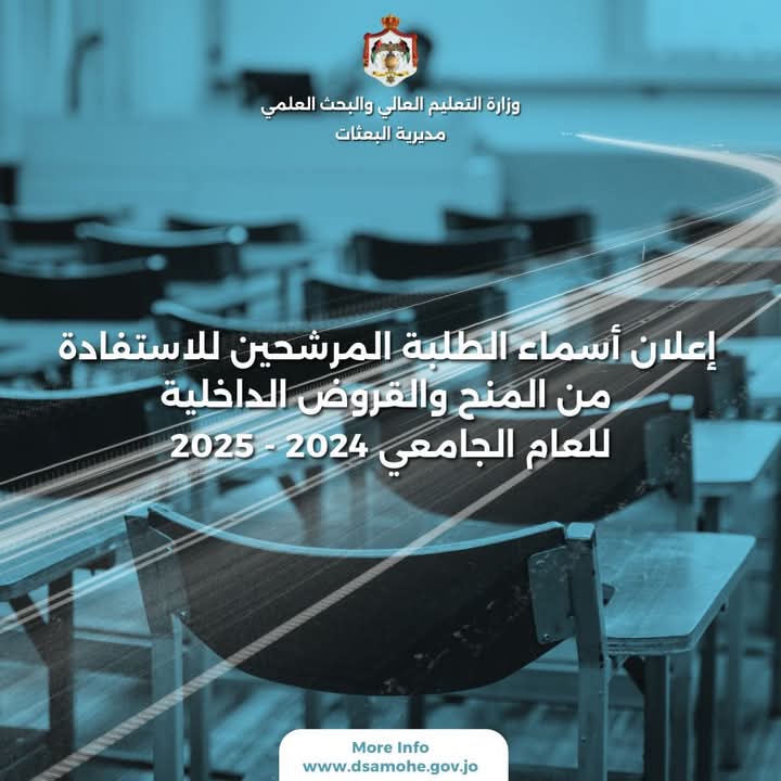 أعلنت وزارة التعليم العالي والبحث العلمي، يوم الخميس الماضي الموافق 30-1-2025 القوائم النهائية لأسماء الطلبة المرشحين للاستفادة من المنح والقروض الداخلية للطلبة الدارسين ضمن البرنامج العادي في الجامعات والكليات الأردنية الرسمية لمستويي البكالوريوس والدبلوم المتوسط للعام الجامعي الحالي 2024-2025، حيث قامت الوزارة بإرسال رسائل نصية بنتائج الترشيح للطلبة على أرقام الهواتف الخلوية المخزنة في طلباتهم، ثم سيتم فتح الموقع الإلكتروني لمديرية البعثات بحيث يتمكن الطلبة من الإطلاع على النتائج المعلنة بكل شفافية.