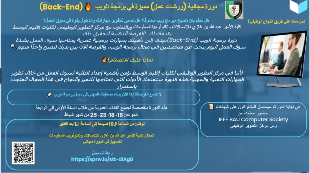 كلية الأمير عبدالله بن غازي للاتصالات وتكنولوجيا المعلومات وبالتعاون مع مركز التطوير الوظيفي لكليات إقليم الوسط يقدمان لك الفرصة من أجل تأهيلك بمهارات برمجية عصرية يحتاجها سوق العمل بشدة(Back-End) دورة برمجة الويب