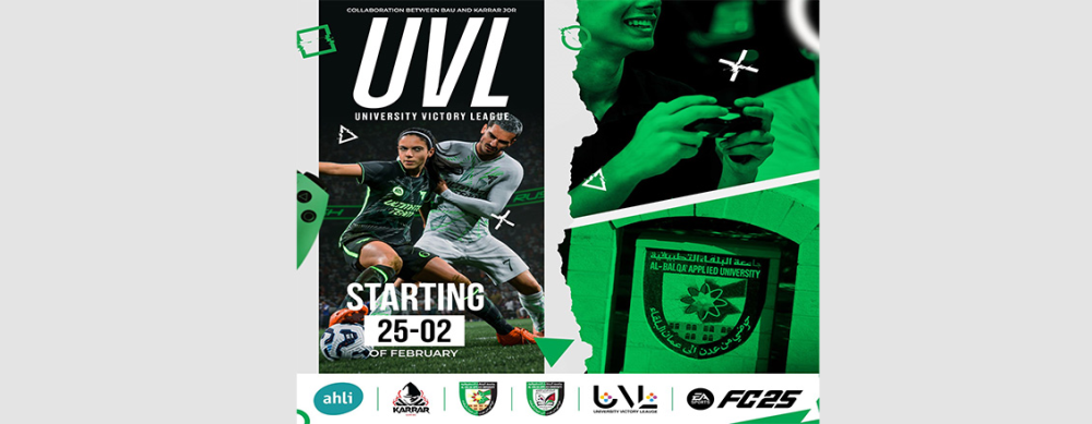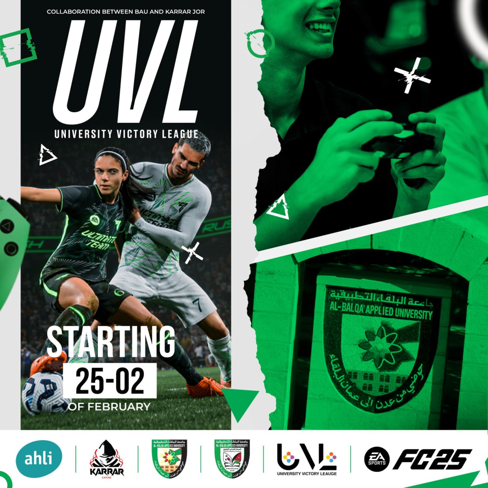 تقيم عمادة شؤون الطلبة والمركز الأردني الكوري للمعلومات وتكنولوجيا الاتصالات في جامعة البلقاء التطبيقية بالتعاون مع منصة كرار أن يعلن لكم عن دوري أبطال الجامعات UVL للعبة كرة القدم FC25.