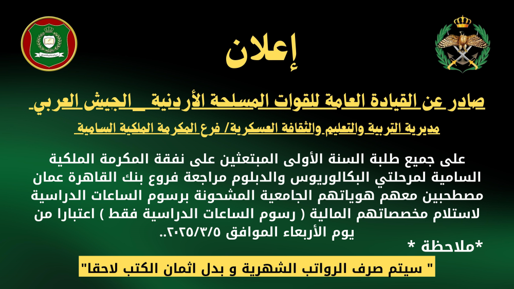 اعلان صادر عن القيادة العامة للقوات المسلحة الأردنية /الجيش العربي
