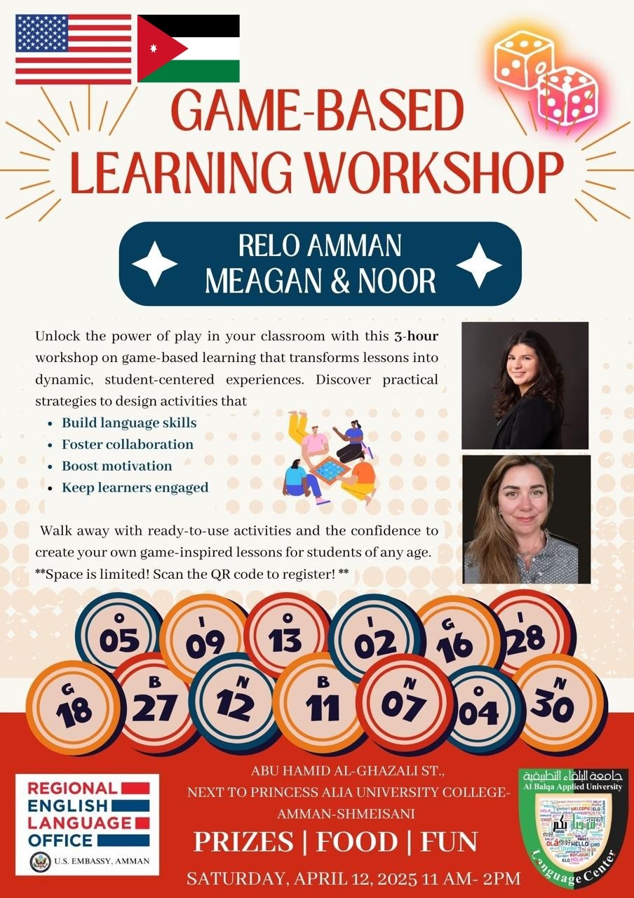 يسرنا في مركز اللغات – جامعة البلقاء التطبيقية أن نذكّر بموعد الورشة الأولى ضمن سلسلة الورش التدريبية لمعلمي اللغة الإنجليزية، والتي تُعقد بالتعاون مع مكتب اللغة الإنجليزية الإقليمي (RELO) التابع للسفارة الأمريكية في عمّان