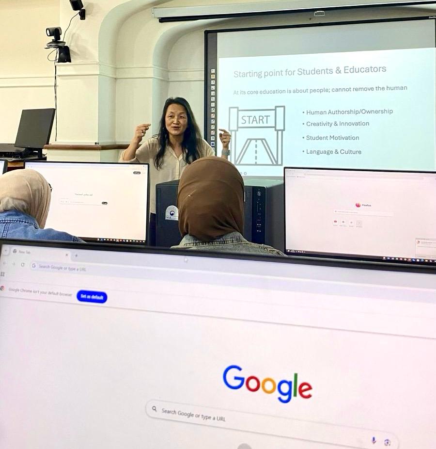 وتناولت ورشة العمل ، استخدام أدوات الذكاء الإصطناعي في تعليم اللغة الإنجليزية، مع التركيز على التطبيقات العملية داخل البيئة التعليمية، لتقديم تجربة تعليمية ممتعة ومحفزة. مما يؤهلهم لسوق العمل الذي أصبح يتطلب مهارات لغوية وتقنية عالية.