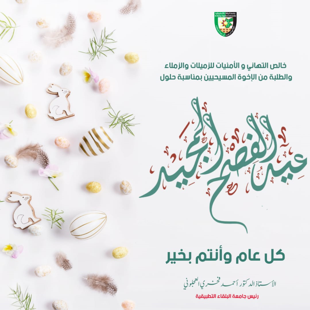 يتقدم رئيس جامعة البلقاء التطبيقية، الأستاذ الدكتور أحمد فخري العجلوني، بأصدق آيات التهنئة وأطيب التمنيات إلى الزميلات والزملاء والطلبة من الإخوة المسيحيين بمناسبة عيد الفصح المجيد ،سائلين الله أن يعيد هذه المناسبة المباركة عليهم وعلى أسرهم بالخير والسلام والمحبة.