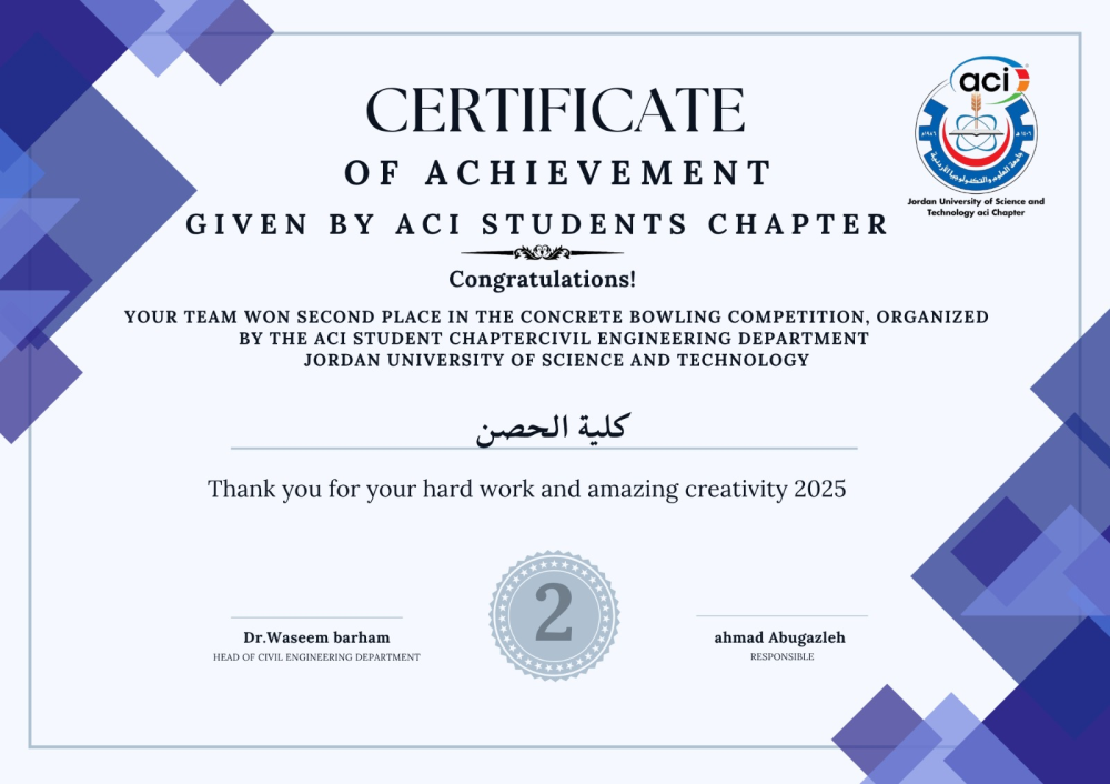 فاز فريق قسم الهندسة المدنية في كلية الحصن الجامعية – جامعة البلقاء التطبيقية بالمركز الثاني في تصميم كرات خرسانية ذات مواصفات خاصة عالمية، ضمن مسابقة Concrete Bowling Competition، التي نظمتها جامعة العلوم والتكنولوجيا الأردنية وبالتعاون مع المعهد الأمريكي للخرسانة (ACI).