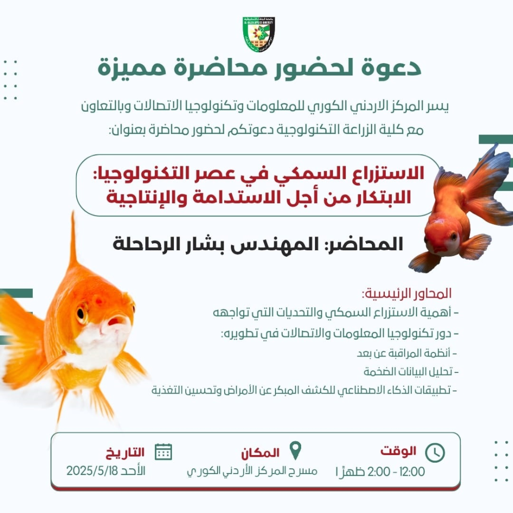 يسر المركز الاردني الكوري للمعلومات وتكنولوجيا الاتصالات وبالتعاون مع كلية الزراعة التكنولوجية دعوتكم لحضور محاضرة بعنوان: (الاستزراع السمكي في عصر التكنولوجيا: الابتكار من أجل الاستدامة والإنتاجية)