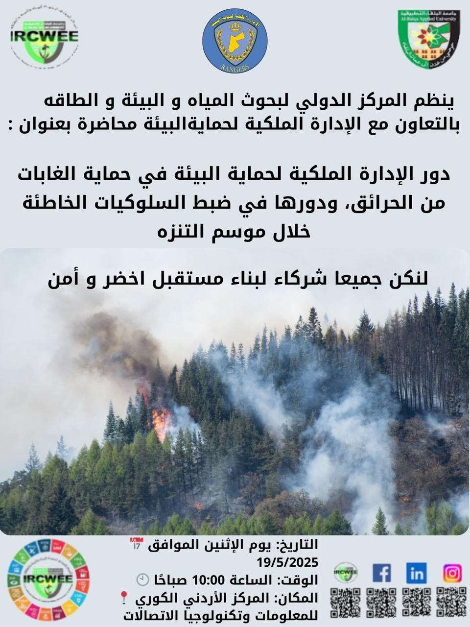 يسر المركز الدولي لبحوث المياه والبيئة والطاقة دعوتكم لحضور محاضرة توعوية بعنوان ( دور الإدارة الملكية لحماية الطبيعة في حماية الغابات من الحرائق وضبط السلوكيات الخاطئة في موسم التنزه )