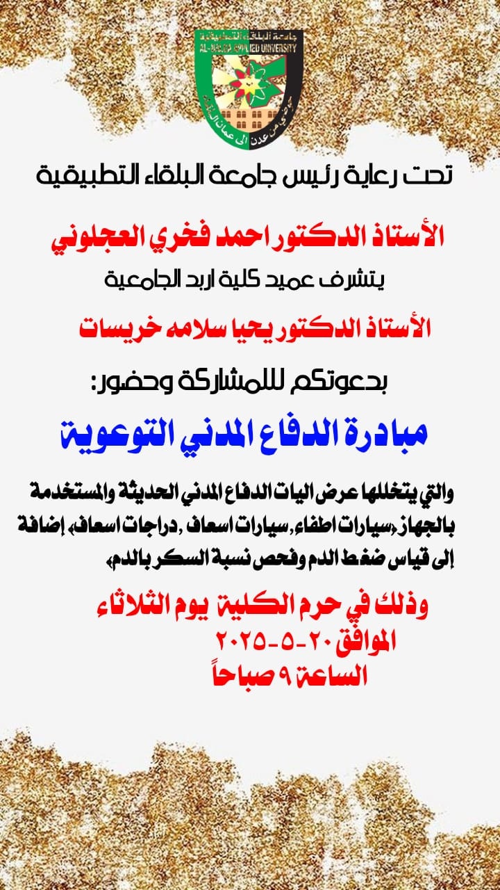 كلية إربد الجامعية تدعوكم للمشاركة في محاضرة (مبادرة الدفاع المدني التوعوية)