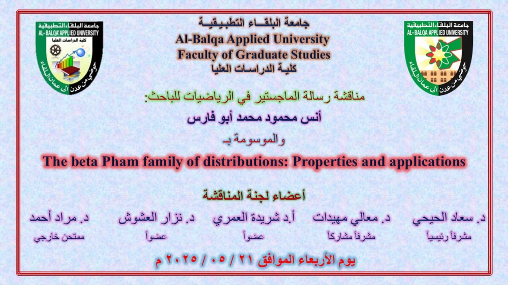 تمت في كلية العلوم في جامعة البلقاء التطبيقية مناقشة رسالة الماجستير في الرياضيات من الطالب انس محمود محمد أبو فارس من قسم الرياضيات بعنوان: