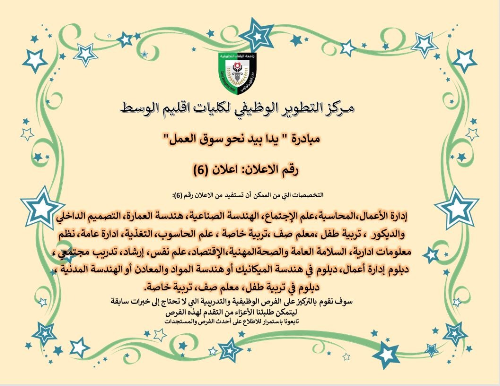 ندعو جميع الطلبة والخريجين إلى متابعة المنصات الرسمية للجامعة للاطلاع على آخر المستجدات والفرص المتاحة، متمنين للجميع مستقبلًا مهنيًا واعدًا ومليئًا بالنجاح.