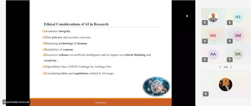 "البحث العلمي والذكاء الاصطناعي: الاعتبارات الأخلاقية والمهنية"، التي ينظمها مركز اللغات في جامعة البلقاء التطبيقية، بمشاركة مجموعة مميزة من الباحثين والمهتمين في مجال الذكاء الاصطناعي وتطبيقاته الأكاديمية.