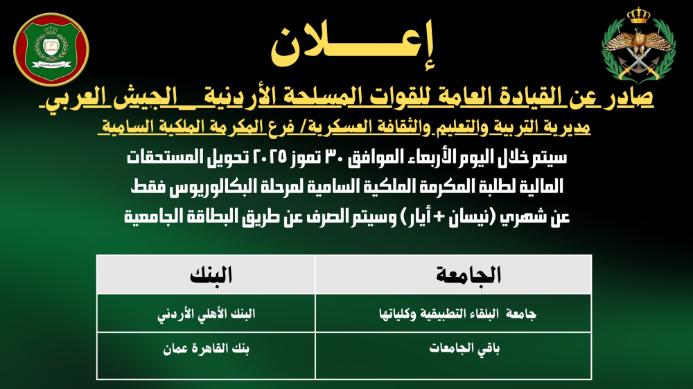 اعلان صادر عن القيادة العامة للقوات المسلحة الأردنية /الجيش العربي _مديرية التربية والتعليم والثقافية العسكرية/فرع المكرمة الملكية السامية