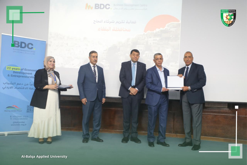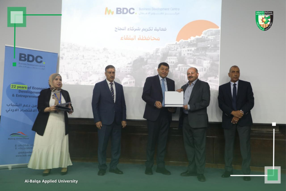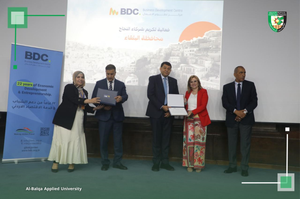 شاركت جامعة البلقاء التطبيقية في حفل تكريم الشركاء الذي نظّمه مركز تطوير الأعمال برعاية عطوفة محافظ البلقاء الدكتور فيصل المساعيد، ومعالي نايف استيتية مؤسس المركز، تقديراً للجهود والإنجازات التي حققتها الجامعة من خلال تعاونها المثمر مع المركز في تنفيذ برامج ومبادرات نوعية تستهدف الطلبة والمجتمع المحلي.
