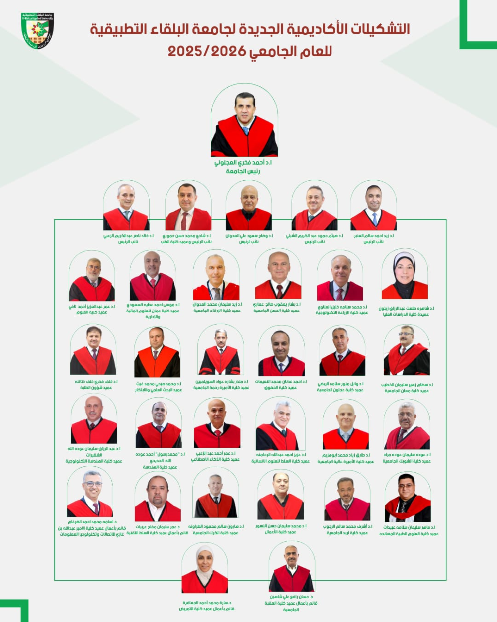 وشملت التشكيلات تجديد تعيين الأستاذ الدكتور هيثم حمود عبد الكريم الشبلي نائباً لرئيس الجامعة، وتعيين الأستاذ الدكتور وضاح سعود علي العدوان نائباً للرئيس أيضًا، لمدة ثلاث سنوات لكل منهما.